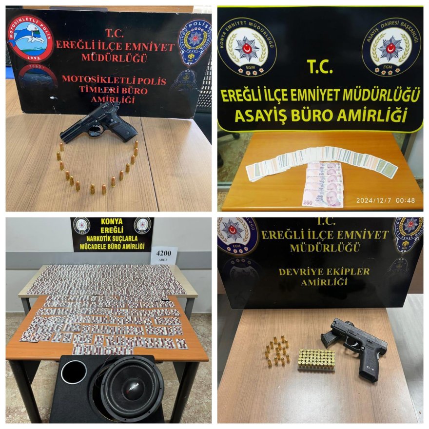 Edinilen bilgiye göre, Ereğli İlçe Emniyet Müdürlüğü ve Ereğli İlçe Jandarma Komutanlığı ekipleri suçlulara yönelik çalışmalarına devam ediyor. Bu çerçevede 2 ile 9 Aralık 2024 tarihleri arasında yapılan operasyon ve denetimlerde; haklarında farklı suçlardan aranma kaydı bulunan 16 şahıs, farklı suçlardan kesinleşmiş hapis cezası ile aranan 10 şahıs, ifadeden dolayı aranan 6 şahıs yakalandı. Denetimlerde bir iş yerine "Kumar oynanması için yer ve imkan sağlama" suçundan işlem yapılırken, içeride kumar oynayan 4 kişiye 25 bin 700 TL idari para cezası uygulandı. Çalışmalarda, 18 narkotik yakalamasında 33 şüpheli şahsa ve kaçakçılık suçundan 1 kişiye işlem yapıldı. Yapılan denetimlerde; 5 ruhsatsız tabanca, 4 bin 264 adet sentetik ecza hap maddesi, 59,48 gram farklı türde uyuşturucu maddesi, 41 bin 200 adet makaron ve 21 kg. kıyılmış tütün ele geçirildi.