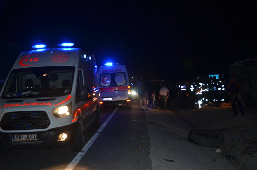 Kaza, Konya Adana Karayolu üzeri Ereğli İlçesi Organize Sanayi civarı meydana geldi. Cihan Şen idaresindeki 42 AFC 466 plaka Tır, Karapınar yönünden Ereğli istikametine seyir halinde olan ve üzerinde 2 adet tanker yüklü olan Tır sürücüsünün direksiyon hakimiyetini kaybetmesi sonucu kontrolden çıkan Tır, önce orta refüje daha sonra savrularak karşı şeride geçerek, Ereğli istikametinden Karapınar yönüne seyir halinde olan Mehmet Vehbi M.nin kullandığı 42 UB 412 plakalı Mısır yüklü tırla çarpıştı. Vatandaşların ihbarı üzerine olay yerine çok sayıda 112 Sağlık, itfaiye, Polis ve Jandarma ekibi sevk edildi. Kazada, Tır sürücüsü Şen olay yerinde hayatını kaybetti. Mehmet Vehbi M. ise yaralandı. Kaza sonrası, Ereğli Karapınar karayolu yaklaşık 1 saat araç trafiğine kapanırken daha sonra yan yoldan ve kontrollü olarak araç trafiğine açıldı.