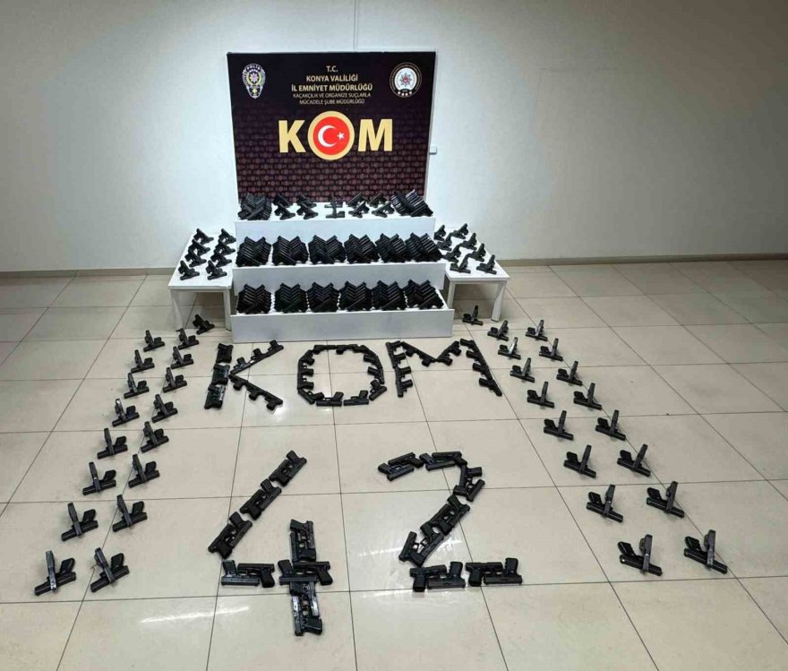 Konya Emniyet Müdürlüğü’ne bağlı Kaçakçılık ve Organize Suçlarla Mücadele Şubesi ekipleri tarafından düzenlenen operasyonda yüzlerce kaçak tabanca ele geçirildi. Olayla ilgili şüpheli baba ve oğlu tutuklandı.