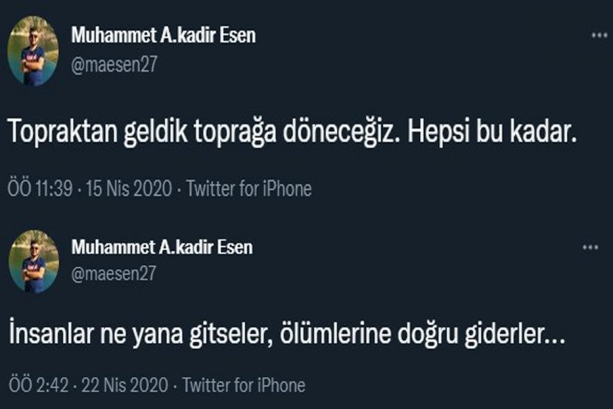 Kazada hayatını kaybeden Muhammed Abdulkadir Esen'in sosyal medya hesabında yaptığı, "İnsanlar ne yana gitseler, ölümlerine doğru giderler", "Topraktan geldik, toprağa döneceğiz. Hepsi bu kadar" paylaşımları yürek burktu.